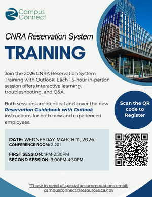 Description: Join our 2026 CNRA Reservation System Training with Outlook instructions for new and experienced employees! Each session is 1 hour and 30 minutes of interactive, in-person learning where you will be able to ask questions and troubleshoot with your peers.