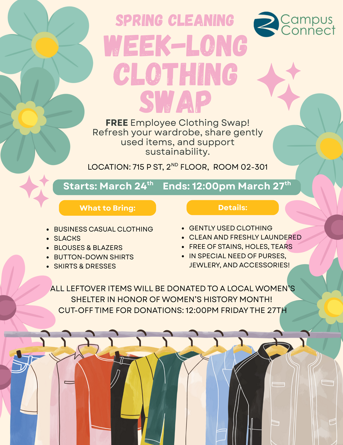 Description: We’re excited to host a FREE clothing swap for employees! This is a great opportunity to refresh your wardrobe, share gently used items, and promote sustainability. Employees can bring gently used, business casual clothing, shoes, purses, jewelry, and accessories to 2nd floor room 2-301 to be sorted and put on display. Shop around for treasures and clothing that matches your personal style, free of charge! Take home something special, while feeling good about purging your wardrobe and donating to others!