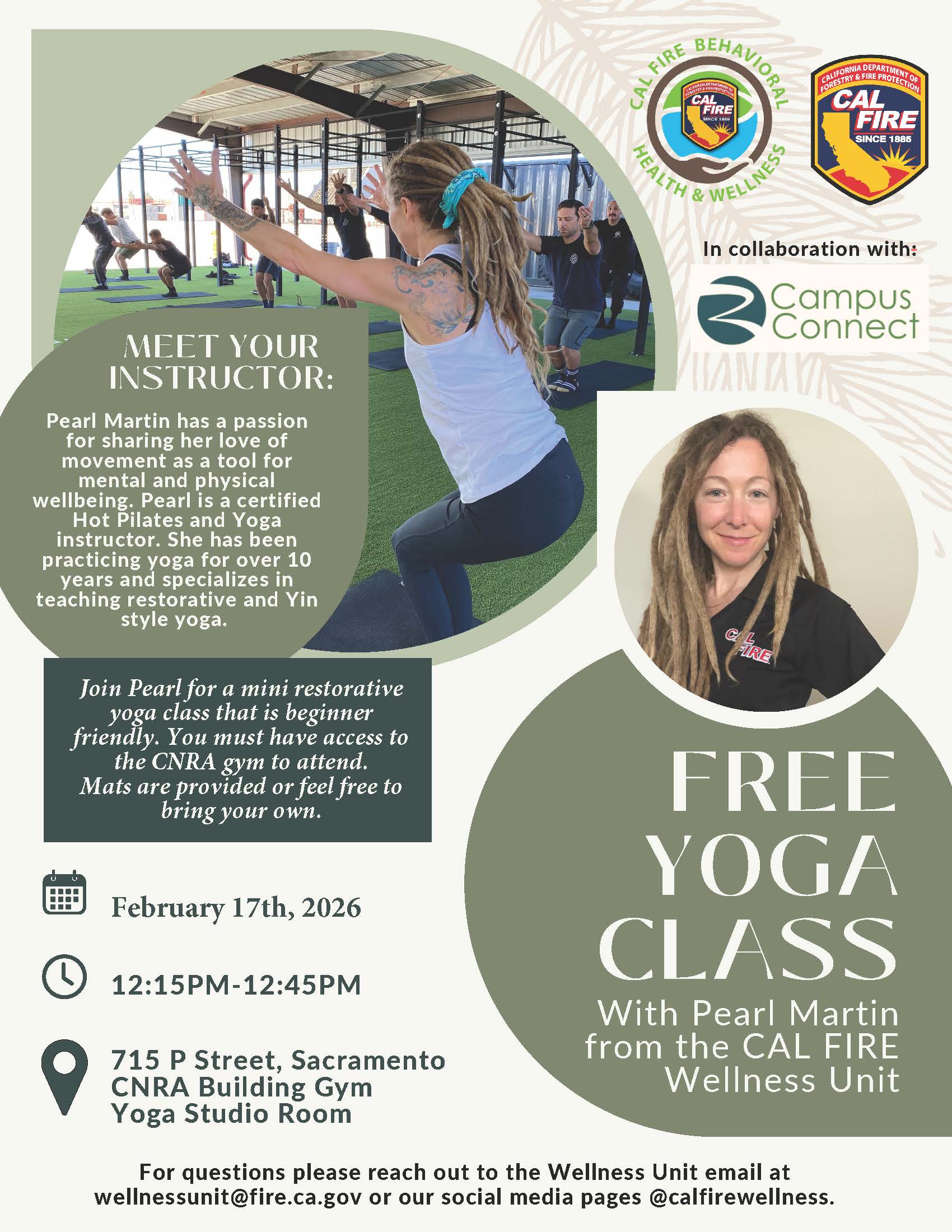 Information Provided: Join CALFIRE staff in-person or virtually for free yoga classes with Pearl Martin from 12:15 - 12:45pm in the CNRA Building Gym Yoga Studio Room. Pearl Martin has a passion for sharing her love of movement as a tool for mental and physical wellbeing. Pearl is a certified Hot Pilates and Yoga instructor. She has been practicing yoga for over 10 years and specializes in teaching restorative and Yin style yoga. For questions, please reach out to the Wellness Unit email at wellnessunit@fire.ca.gov or through their social media pages @calfirewellness.