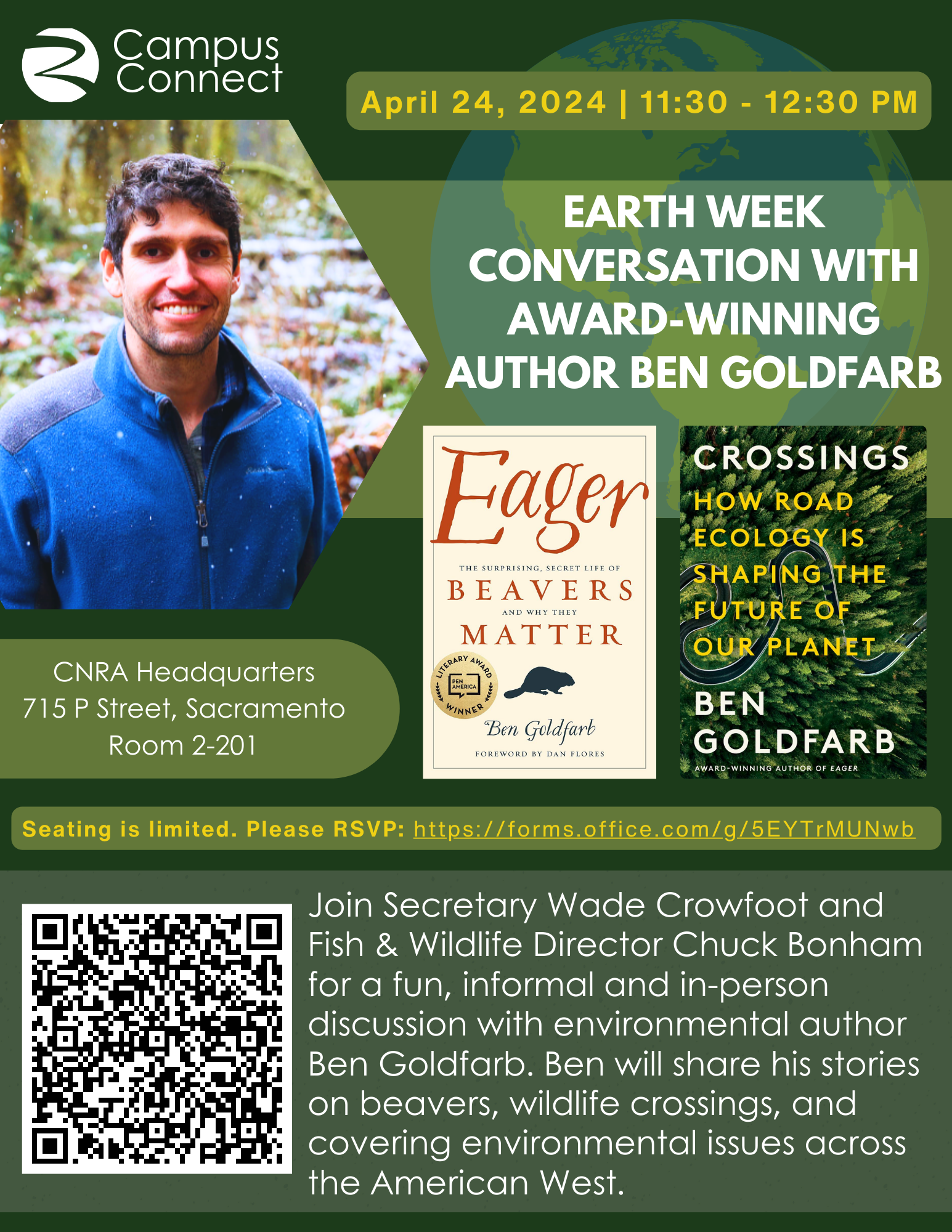 Join Secretary Wade Crowfoot and Fish & Wildlife Director Chuck Bonham on April 24th from 11:30-12:30pm at CNRA Headquarters for a fun, informal and in-person discussion with environmental author Ben Goldfarb. Ben will share his stories on beavers, wildlife crossings, and covering environmental issues across the American West.